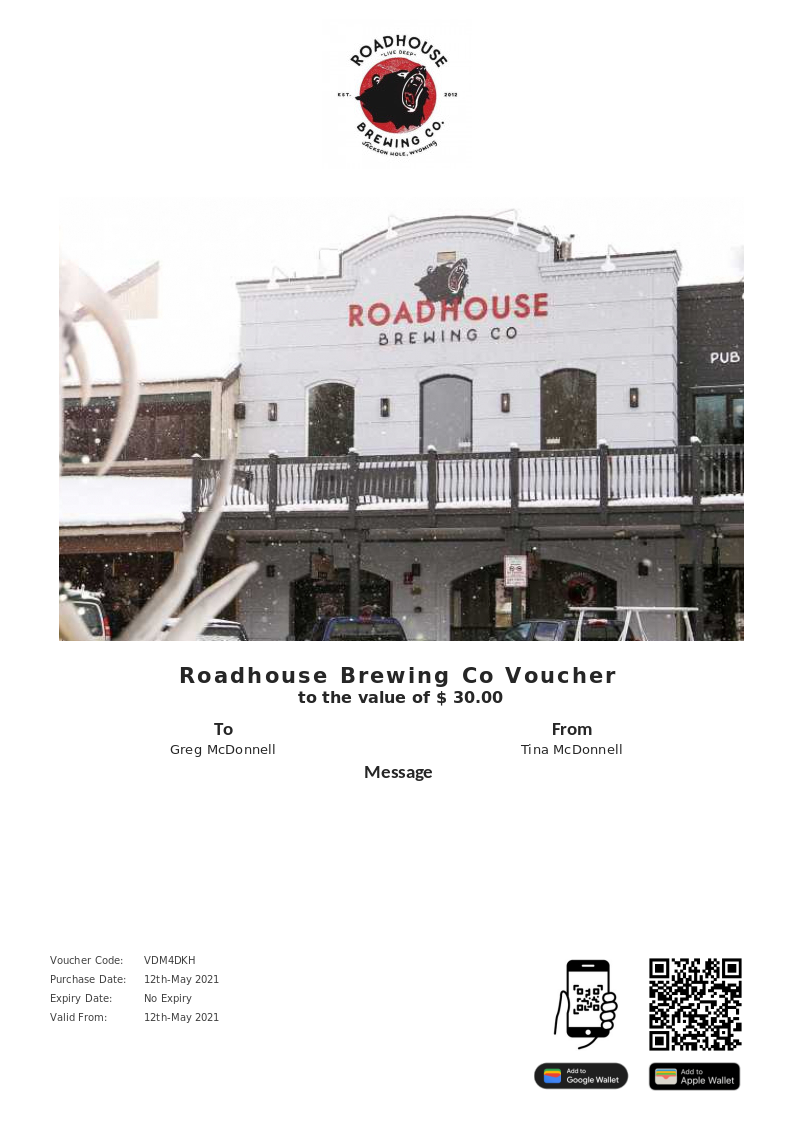 Roadhouse Brewing Co allows you to purchase instantly printable gift vouchers, special offers and tickets using the Voucher Connect platform.